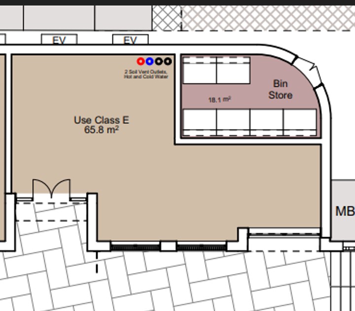 This unit is to be split into two separate Class E units.  Although shown as two separate units on the plan, we are looking to Lease this area as one larger unit with outside space.